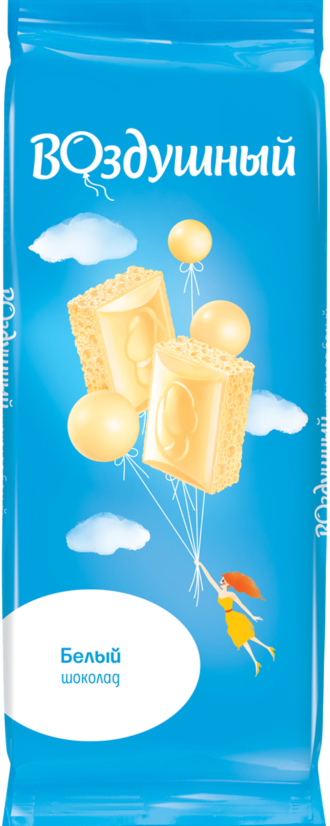Белый шоколад «Воздушный» подойдет в качестве перекуса в любое время дня. Обладает нежной воздушной структурой и легким вкусом. Шоколад имеет мягкое послевкусие. В составе какао, молоко и ваниль. Когда шоколадные пузырьки попадают в рот, они начинают лопаться. Отлично подойдет как дополнение к чаю или кофе. Миллион пузырьков в шоколаде.
