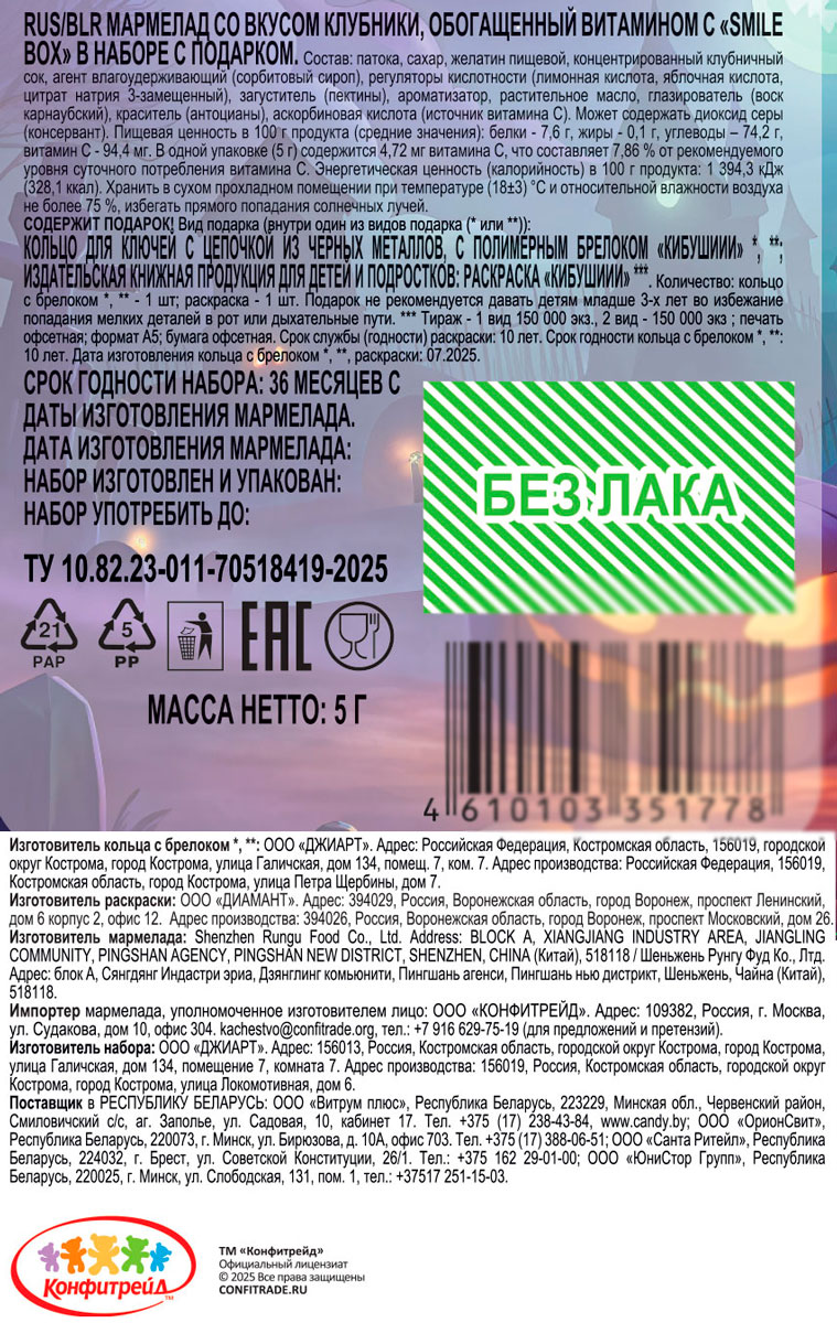Сладкий набор с прикольным подарком, от которого мурашки бегут от восторга! Внутри коробочки – жутко вкусный мармелад с витамином С и уникальный брелок-сюрприз. Микс вложений. Две коллекции брелоков: объёмные 3D-фигурки монстриков и плоские 2D-брелоки с ужасно милыми символами Хеллоуина, а также раскраска. В каждой коллекции по 10 брелоков, среди которых есть один, светящийся в темноте. Найди главный талисман Хеллоуина! Сможешь собрать все или испугаешься? Стань главным охотником за сладостями и брелоками и погрузись в атмосферу ужаса и веселья!