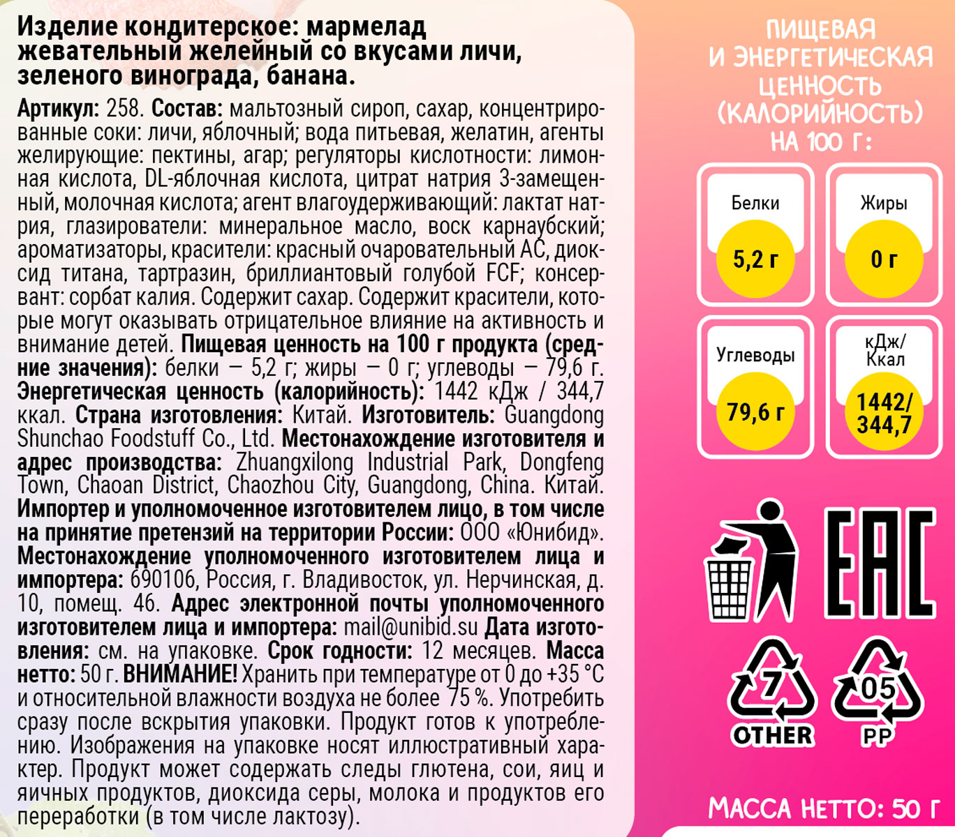Жевательный желейный мармелад с тремя вкусами — личи, зелёный виноград и банан — это маленькое фруктовое путешествие в каждом кусочке. Нежная текстура приятно тянется и тает во рту, а каждый вкус звучит по-своему: личи — лёгкий и экзотический, зелёный виноград — сочный и освежающий, банан — мягкий и сладкий. Идеально, когда хочется «чего-нибудь вкусненького» — к кофе, в дорогу, на учёбу, в офис или чтобы поделиться с друзьями. Три вкуса в одной упаковке — больше настроений, больше удовольствия.