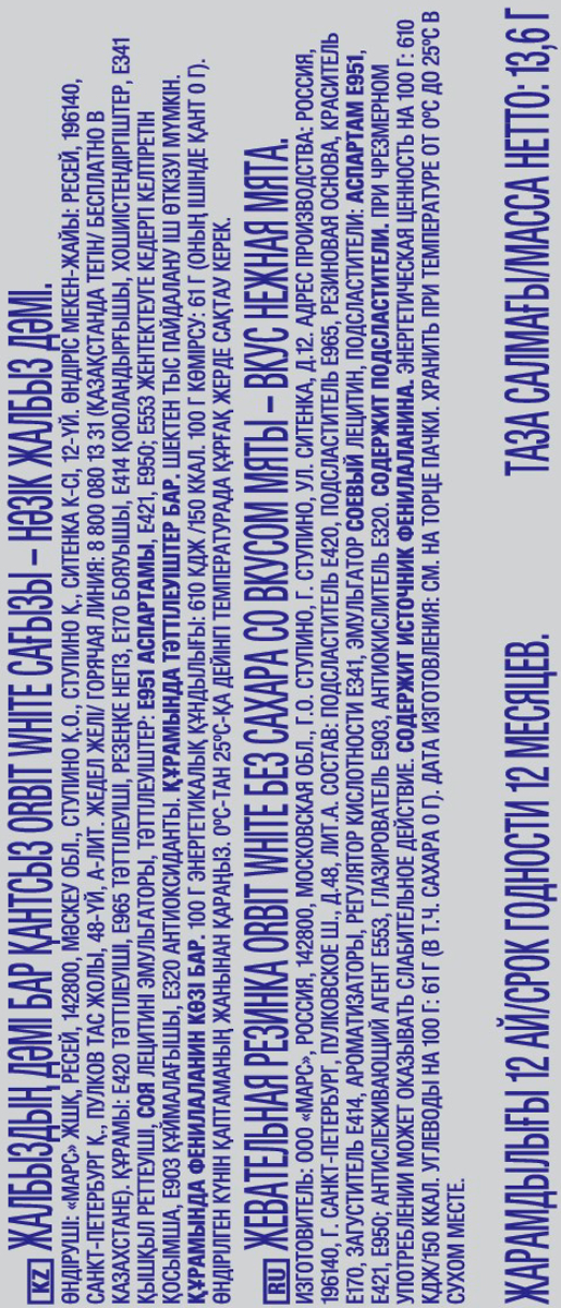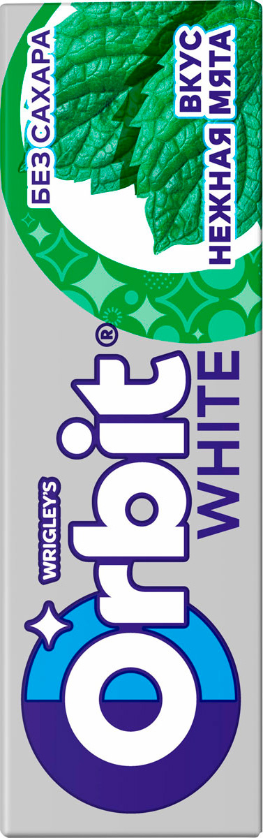 Wrigley — жевательная резинка, которой отдают предпочтение миллионы людей по всему миру. Это первая жвачка, получившая сертификацию и одобрение Американской Стоматологической Ассоциации после почти 20-ти лет исследований, доказавших, что эти жевательные резинки укрепляют эмаль, уменьшают рост зубного налета и помогают предотвратить появление кариеса. Orbit Нежная мята — это неповторимый вкус мяты, бережно освежает дыхание и делает вашу улыбку белоснежной!