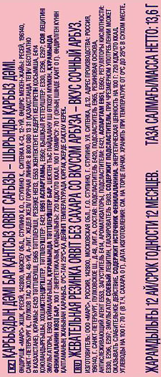 Wrigley — жевательная резинка, которой отдают предпочтение миллионы людей по всему миру. Это первая жвачка, получившая сертификацию и одобрение Американской Стоматологической Ассоциации после почти 20-ти лет исследований, доказавших, что эти жевательные резинки укрепляют эмаль, уменьшают рост зубного налета и помогают предотвратить появление кариеса. Orbit Сочный арбуз — это яркий насыщенный вкус, великолепно освежает дыхание и делает вашу улыбку белоснежной!