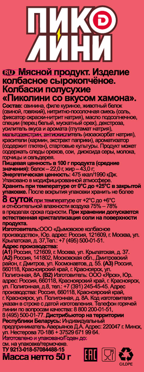 Колбаски Пиколини Хамон сырокопченые 50 г