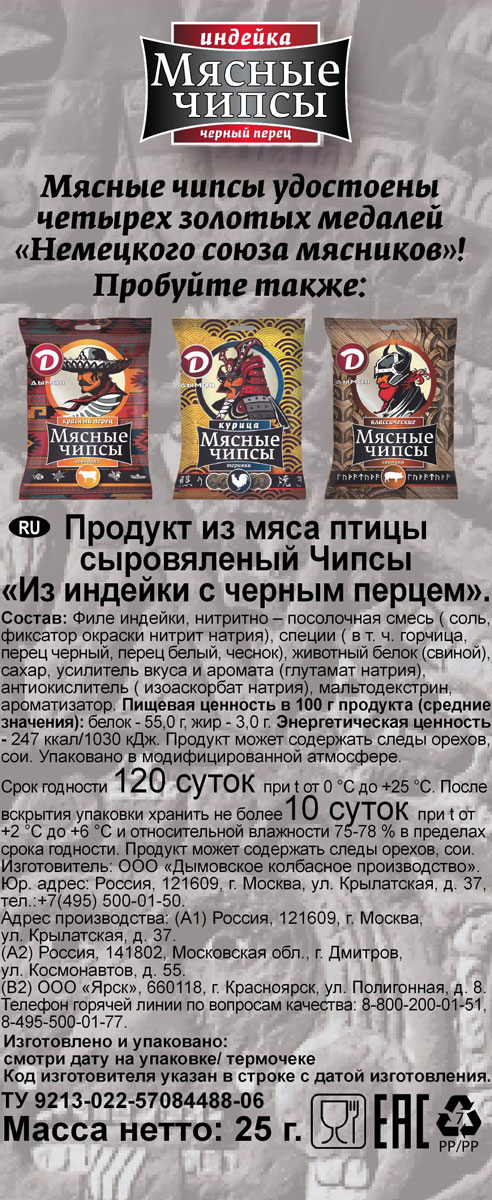 Чипсы Дымов мясные из индейки с черным перцем