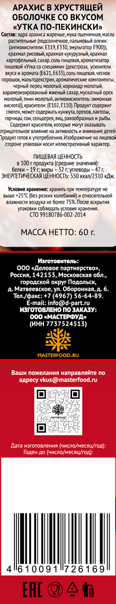 Хочется вкусного и необычного? Попробуйте отборный арахис в нежной хрустящей корочке. Орех обсыпают ароматными специями и обжаривают в печи до золотистого цвета. Эта технология обеспечивает хруст корочки и оптимальную прожарку арахиса. Купаж специй со вкусом «Утка по-пекински» дополняет кремово-сливочный вкус арахиса. Закройте глаза и очутитесь на оживленной улочке, наполненной ароматами специй экзотической азиатской кухни.