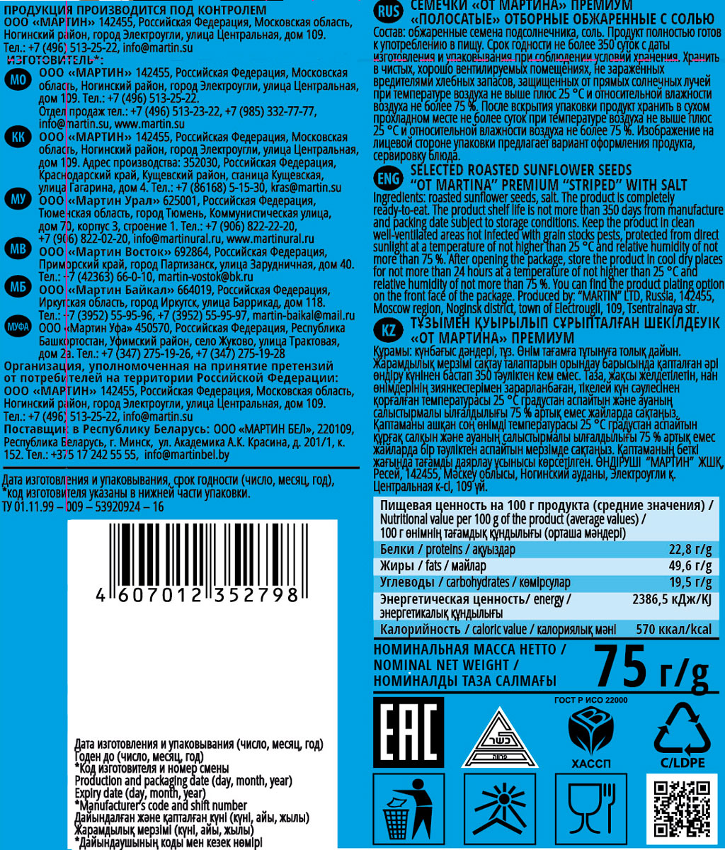 Соленые семечки полосатые от Мартина – это экологичный продукт высшего качества. При производстве используется только отборное сырье из Турции, где идеальные условия для выращивания подсолнечника этого вида.