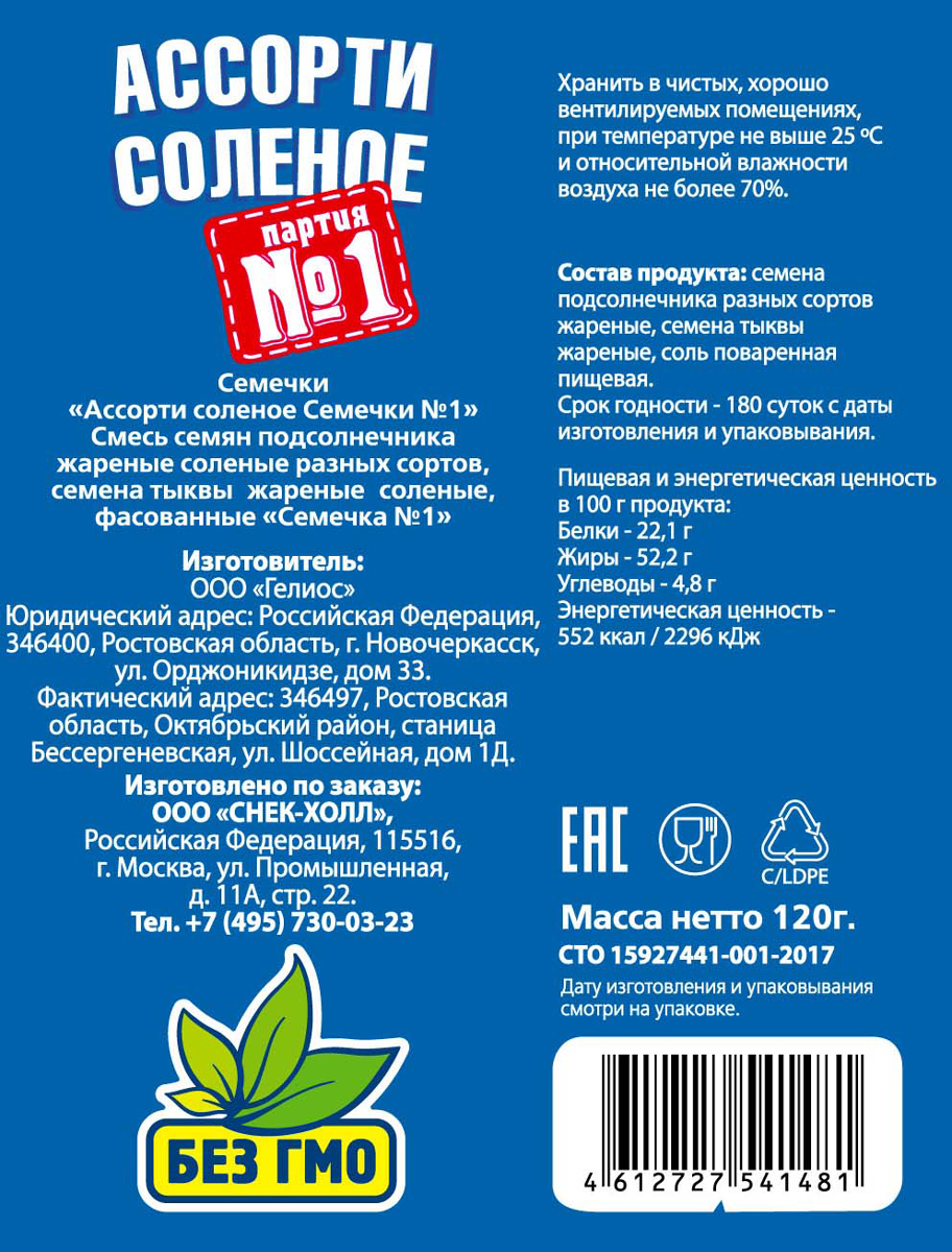 Семечки жареные соленые Ассорти тыквенная полосатая черная