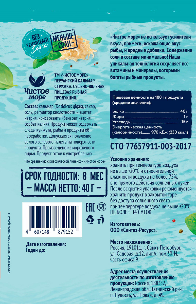 Продукция изготовлена без использования усилителей вкуса, примесей, искажающих вкус рыбы, без вредных добавок. Содержание соли в составе минимально. Уникальная технология сохраняет все витамины и минералы, которыми богаты рыбные продукты. Линейка "Чистое море" без усилителей вкуса, создана специально, чтобы вы могли насладиться природным и насыщенным вкусом морепродуктов.