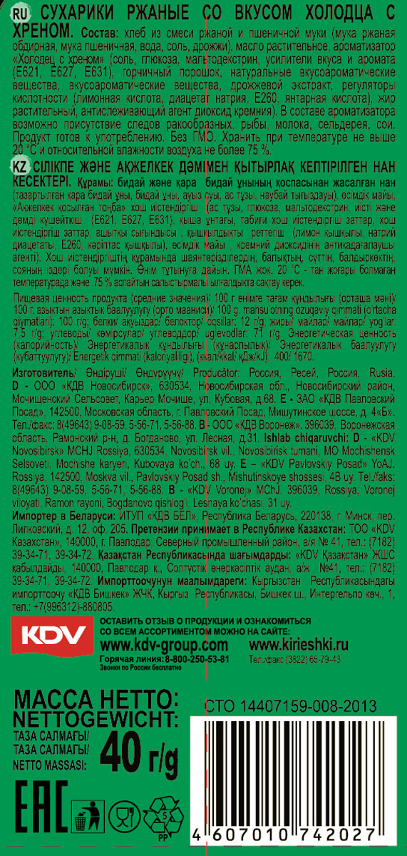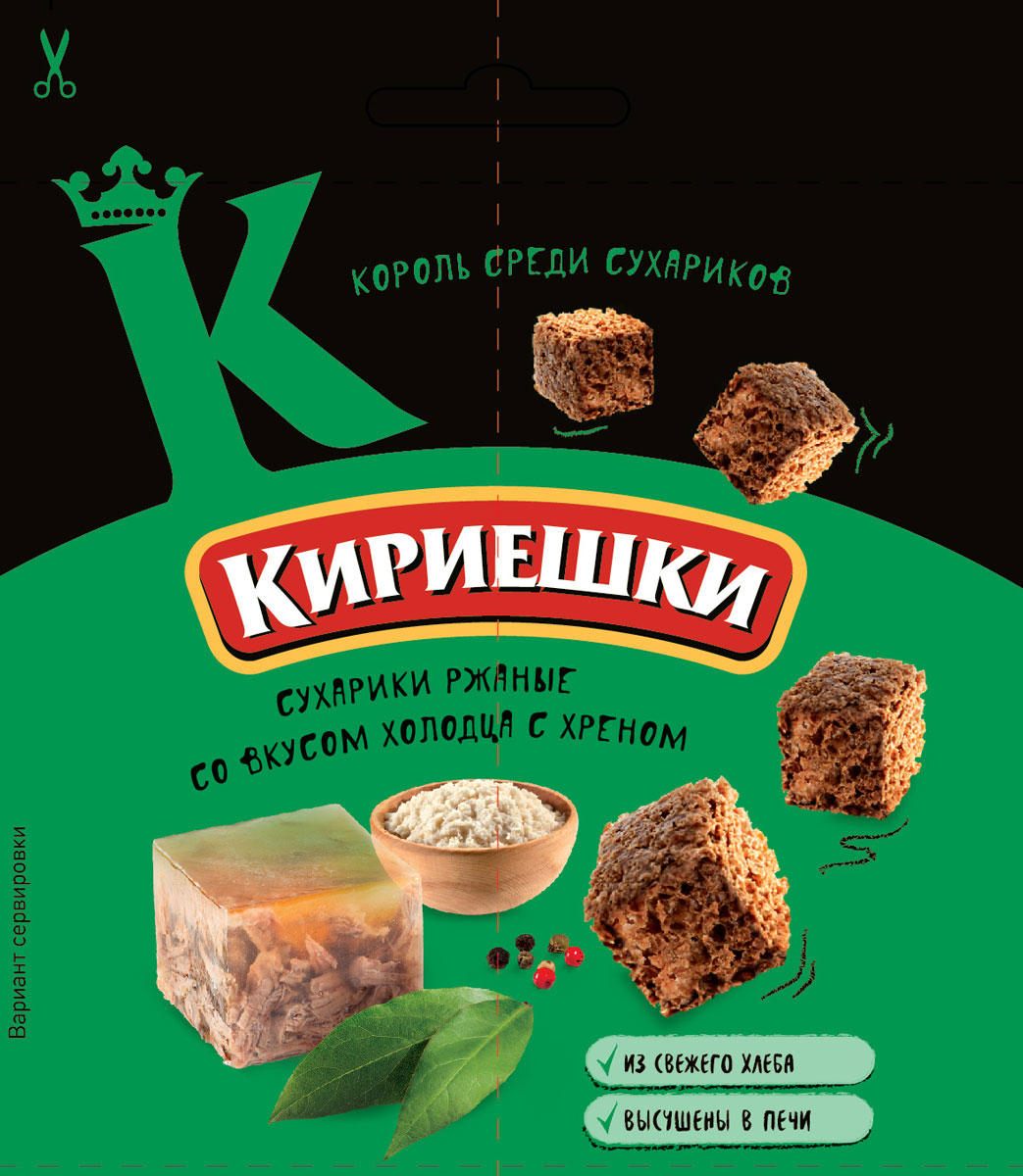 Ржано-пшеничные сухарики со вкусом холодца с хреном. Для «Кириешек» используется свежеиспеченный хлеб. Сухарики производят без обжарки во фритюре. Современная технология сохраняет полезные свойства злаковых культур и обеспечивает сухарикам незабываемый вкус.