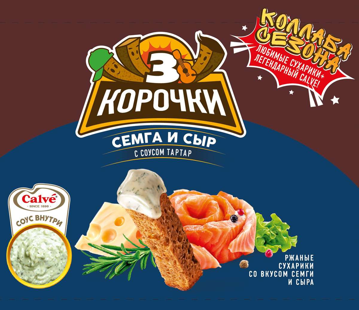 Ржаные сухарики со вкусом семги с сыром и соусом тартар внутри. Для «3-х Корочек» используется свежеиспеченный хлеб. Сухарики производят без обжарки во фритюре. Современная технология сохраняет полезные свойства злаковых культур и обеспечивает сухарикам незабываемый вкус. Соус тартар, как прекрасное дополнение к трапезе, находится внутри пачки с сухариками.