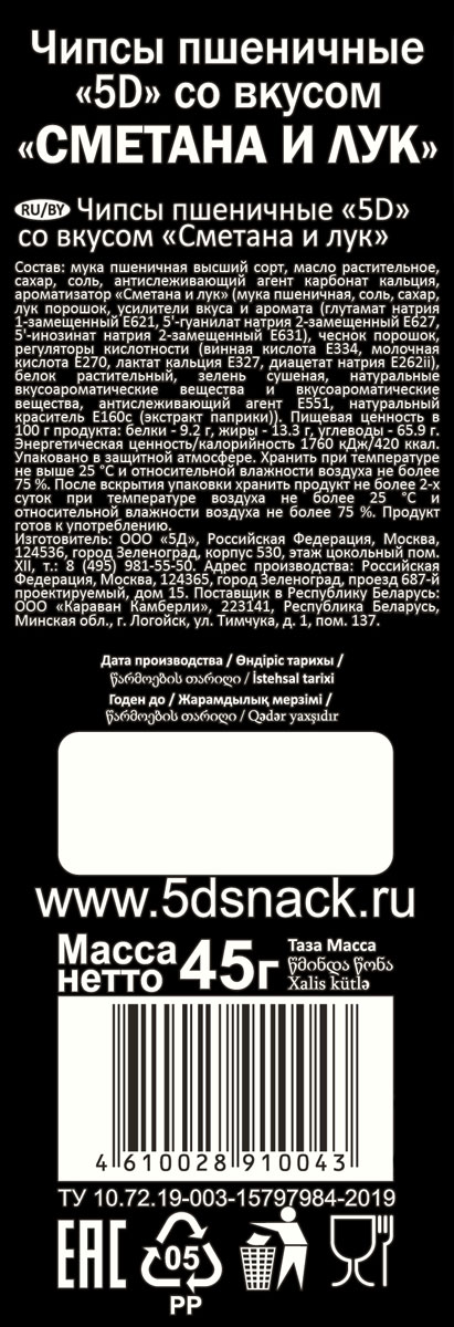 Чипсы 5D со вкусом «Сметана и лук» — это инновационный продукт. Объёмные, хрустящие и лёгкие пшеничные чипсы изготовлены в виде аппетитных подушечек со вкусом свежей деревенской сметаны и ароматом молодого зеленого лука. Попробуйте и почувствуйте новые оттенки любимых вкусов, которые наиболее ярко раскрываются на пшеничной основе. Уникальная технология создает неповторимый вкус и звонкий хруст.
