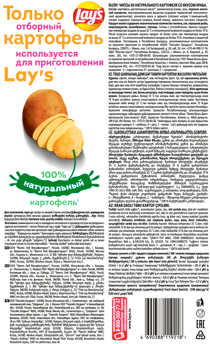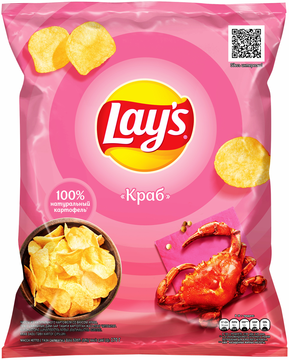 Чипсы Lay's со вкусом нежного камчатского краба приготовлены специально для ценителей Lay's. Чипсы Lay's — отличное сочетание вкуса краба и золотистых картофельных чипсов. Lay's непременно подарят вам вихрь удовольствия!
