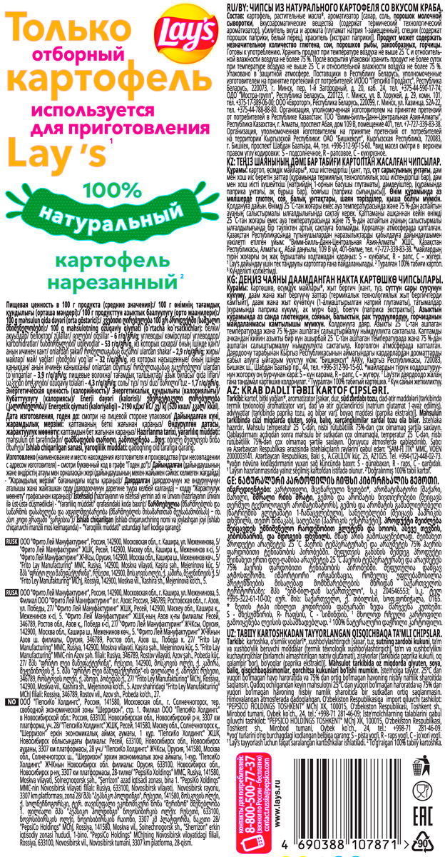 Чипсы Lay's со вкусом нежного камчатского краба приготовлены специально для ценителей Lay's. Чипсы Lay's — отличное сочетание вкуса краба и золотистых картофельных чипсов. Lay's непременно подарят вам вихрь удовольствия!