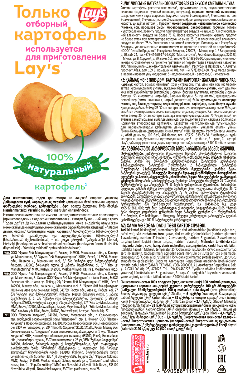 Чипсы Lay's приготовлены из отборного картофеля. Тонкие хрустящие чипсы Lay's золотистого цвета имеют выраженный вкус сметаны и лука, который они приобретают благодаря добавлению ароматических веществ. Чипсы Lay's быстро утоляют чувство голода, поэтому подходят для перекуса в течение дня. Lay's удобно брать с собой в дорогу, на природу. Чипсы Lay's можно использовать в кулинарии при приготовлении некоторых салатов и закусок. Вакуумная упаковка Lay's способствует длительной сохранности продукта.