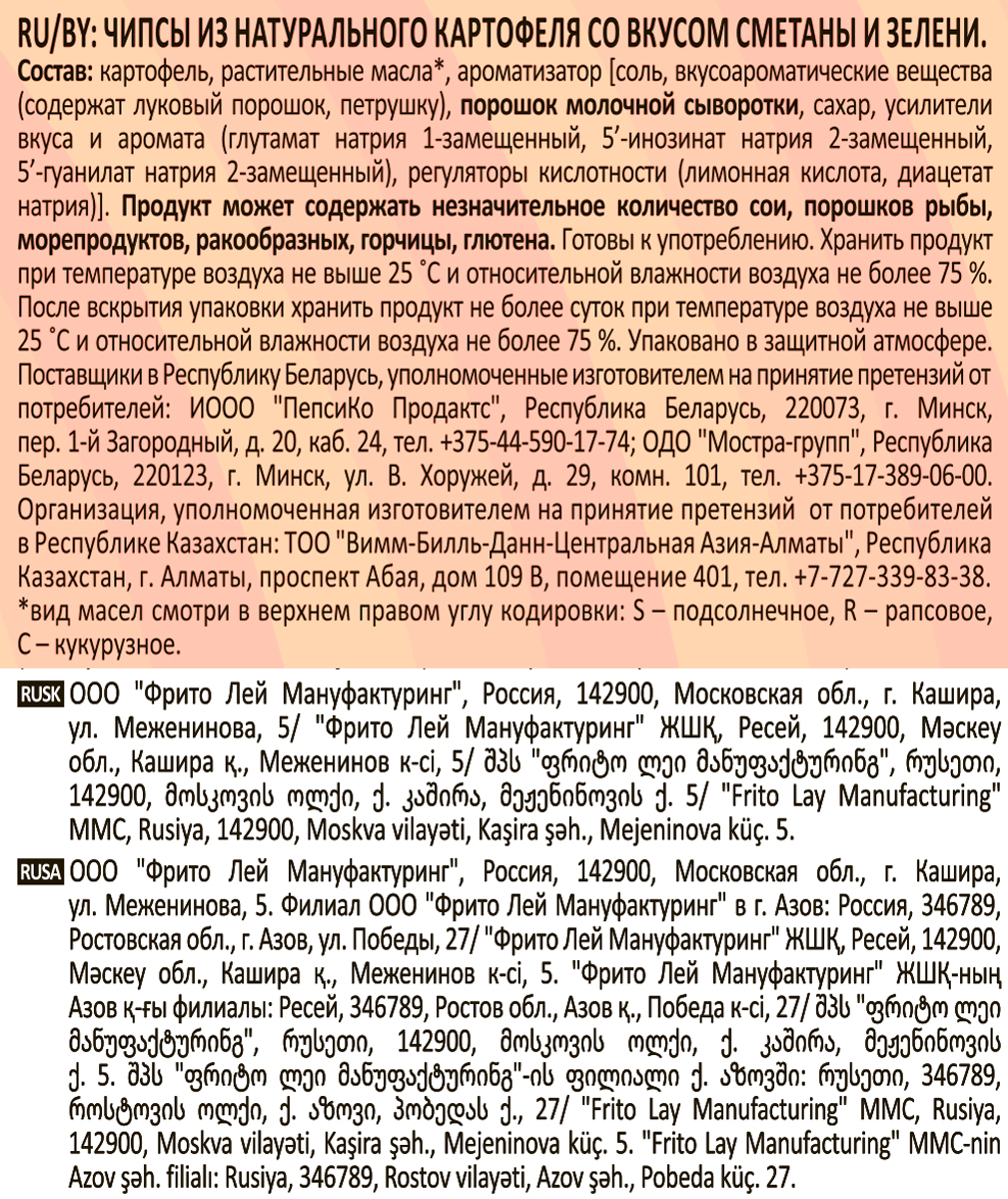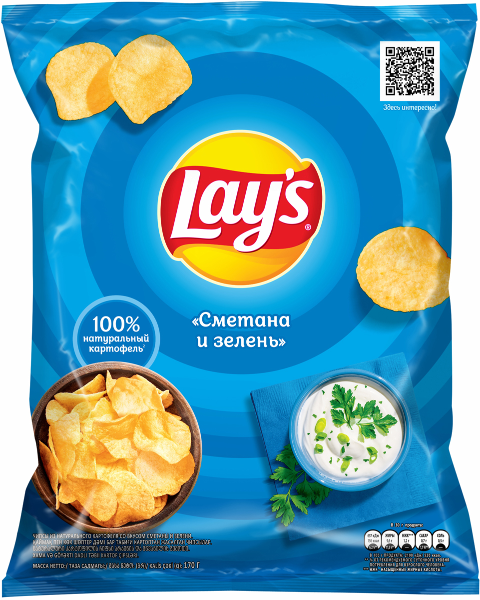 Чипсы Lay's приготовлены из отборного картофеля. Тонкие хрустящие чипсы Lay's золотистого цвета имеют выраженный вкус сметаны и зелени, который они приобретают благодаря добавлению ароматических веществ. Чипсы Lay's быстро утоляют чувство голода, поэтому подходят для перекуса в течение дня. Lay's удобно брать с собой в дорогу, на природу. Чипсы Lay's можно использовать в кулинарии при приготовлении некоторых салатов и закусок. Вакуумная упаковка Lay's способствует длительной сохранности продукта.