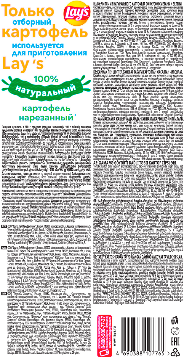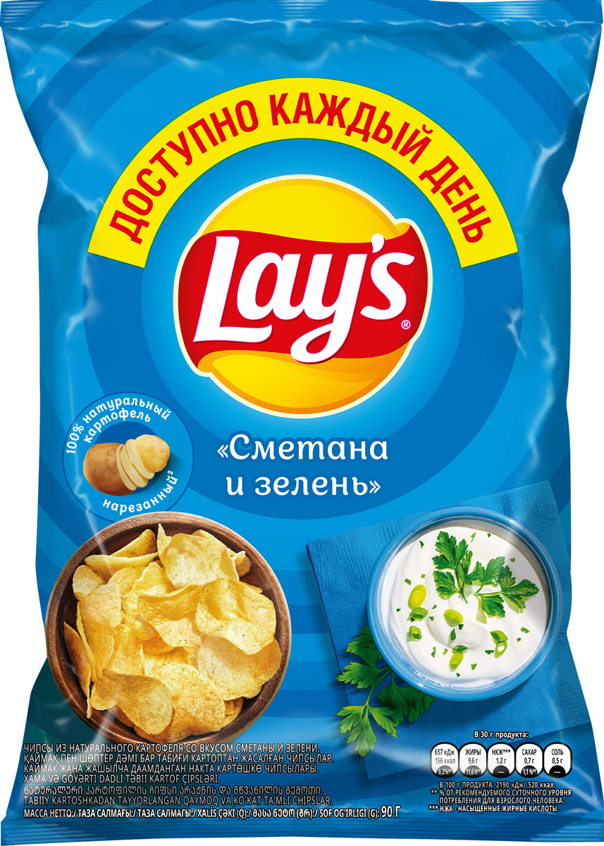 Чипсы Lay's приготовлены из отборного картофеля. Тонкие хрустящие чипсы Lay's золотистого цвета имеют выраженный вкус сметаны и зелени, который они приобретают благодаря добавлению ароматических веществ. Чипсы Lay's быстро утоляют чувство голода, поэтому подходят для перекуса в течение дня. Lay's удобно брать с собой в дорогу, на природу. Чипсы Lay's можно использовать в кулинарии при приготовлении некоторых салатов и закусок. Вакуумная упаковка Lay's способствует длительной сохранности продукта.