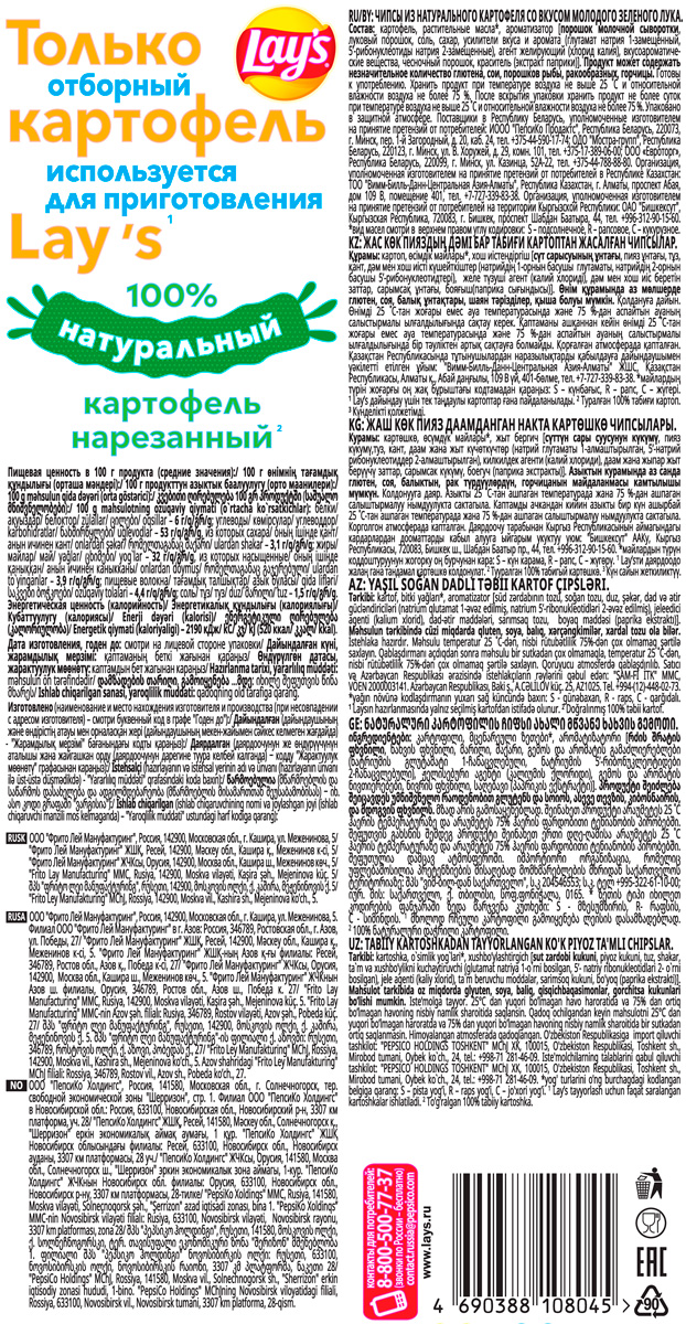 Lay's — чипсы гарантированного высочайшего качества и вкуса. Секрет успеха — в отборе картофеля для их приготовления. Производитель тщательно контролирует весь процесс производства, что гарантирует безопасность продукта.