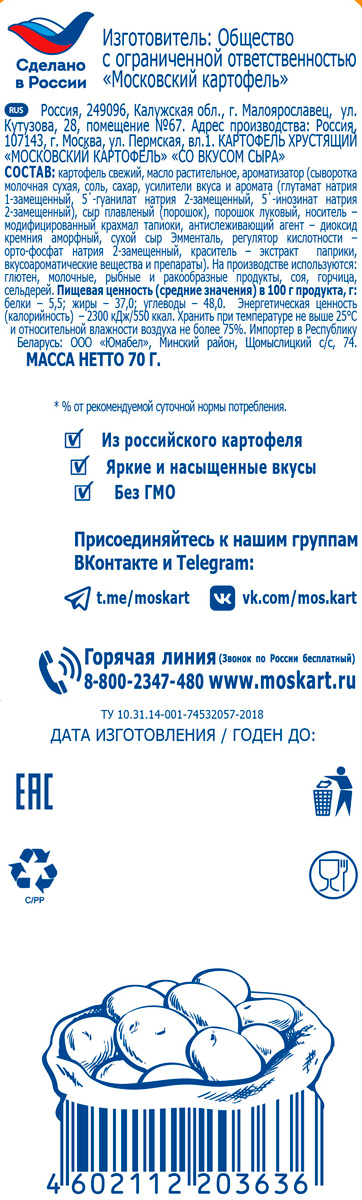 Для производства этих чипсов используется исключительно натуральный картофель, который проходит несколько этапов отбора, обработки и очистки. В итоге только самые лучшие клубни нарезаются до тоненьких ломтиков и приправляются качественными специями, именно поэтому чипсы получаются такими хрустящими и вкусными. «Московский картофель» с насыщенным вкусом сыра — классика, никогда не выходящая из моды. Не отказывайте себе в удовольствии!
