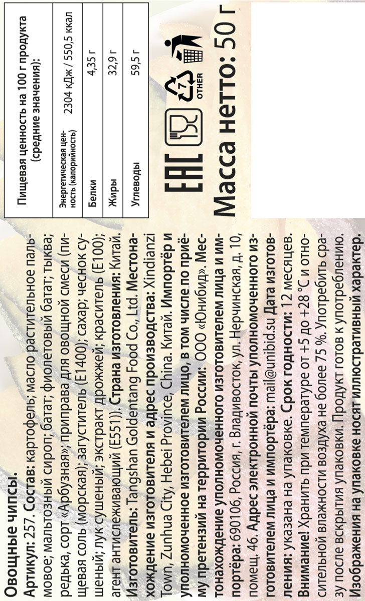 Овощные чипсы — яркий хруст и лёгкий перекус. Интересный микс специй и овощей в одной упаковке: картофель, батат, фиолетовый батат, тыква, редька (сорт Арбузная). Удобно взять с собой в дорогу, офис или на прогулку.