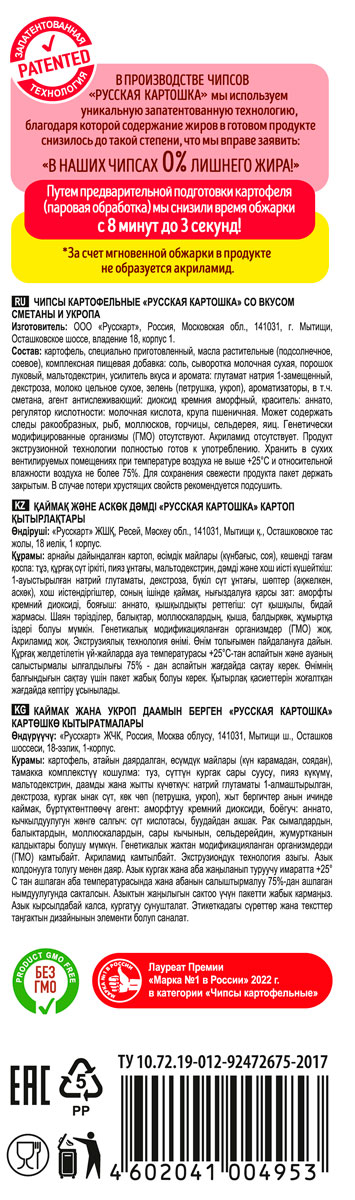 «Русская картошка» сметана и укроп – классический вкус любимых чипсов! Сливочная деревенская сметанка и нотка молодого весеннего укропа отлично сочетаются с их воздушной структурой. Перекусите сами и поделитесь с друзьями!