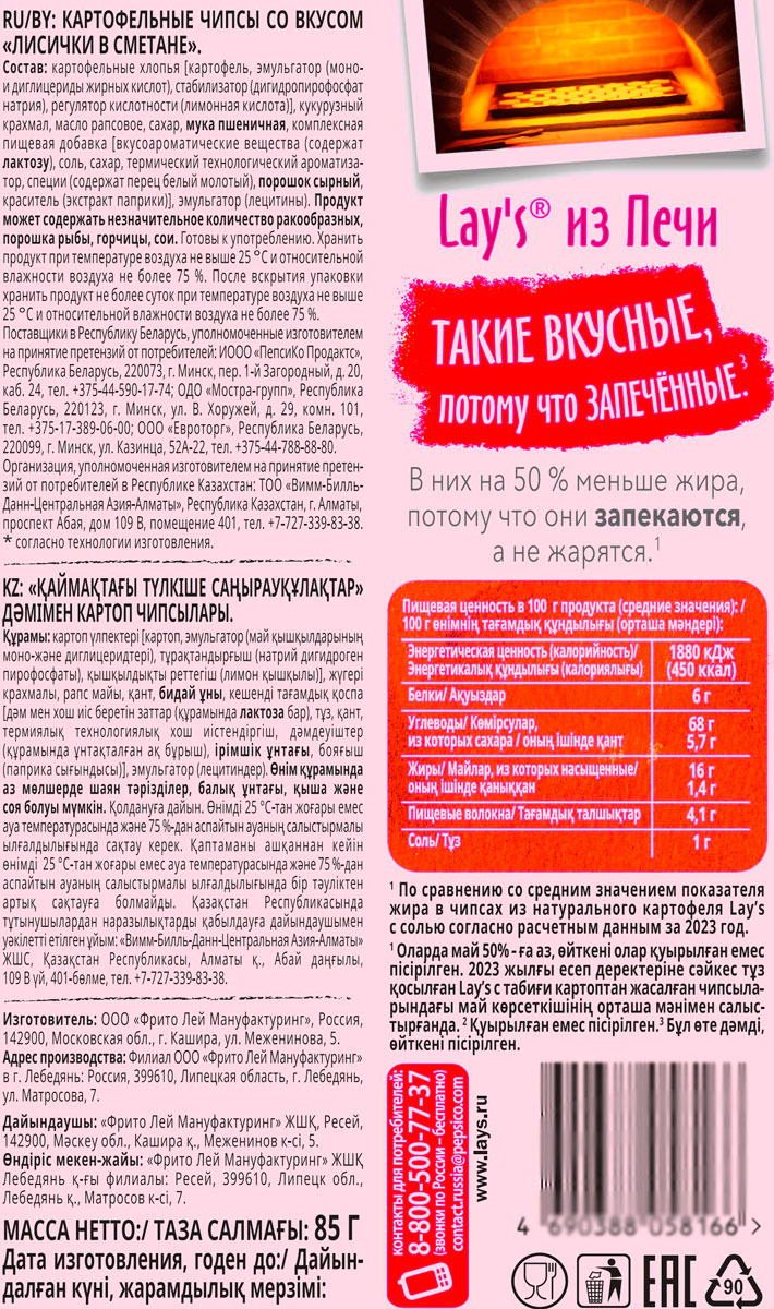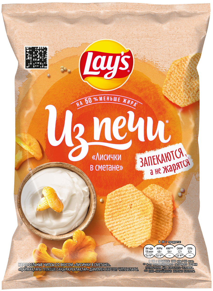 Lay's «Из печи» «Лисички в сметане» — это изысканный тандем вкуса и хрустящих ломтиков чипсов. Они приготовлены путем запекания, а не обжаривания, поэтому в них на 50% меньше жира*. Чипсы Lay's «Из печи» — такие вкусные, потому что запеченные!