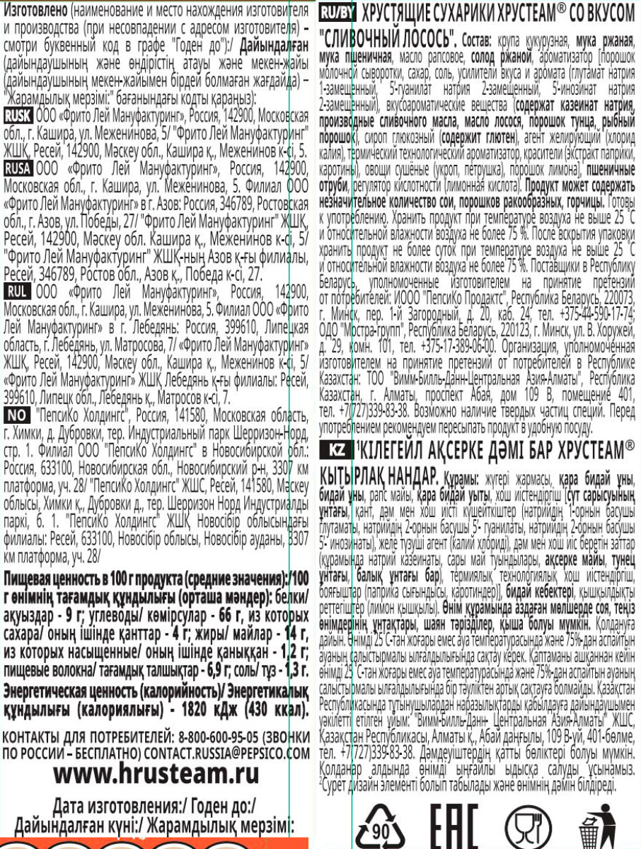 Ржаные сухарики «Хрустим» со вкусом сливочного лосося с уникальной легкой текстурой. Их можно употреблять в качестве сытного перекуса или легкой закуски к прохладительным напиткам.