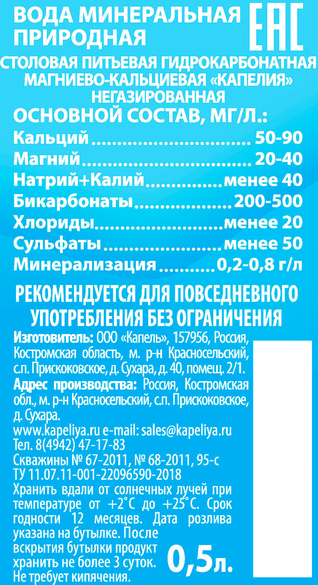 Минеральная природная столовая питьевая магниево-кальциевая вода «Капелия» имеет сбалансированный состав солей и минералов. Содержит гидрокарбонаты, сульфаты, хлориды, кальций, магний, калий, натрий. Рекомендована для повседневного употребления.