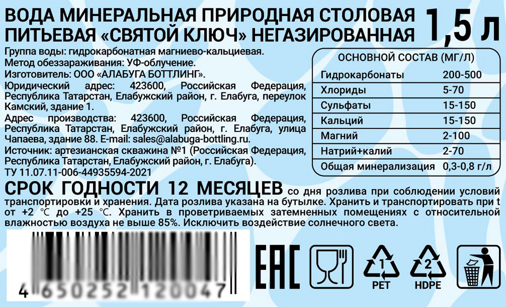 «Святой Ключ» — минеральная вода из Республики Татарстан, при производстве которой используется природная вода, добытая из артезианских скважин. Благодаря этому, в составе содержится оптимальное количество минералов и микроэлементов. Использование щадящих методов фильтрации не нарушает природную структуру воды, сохраняя всю пользу для человека.