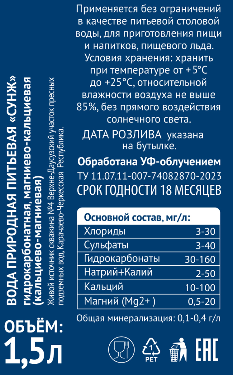 Негазированная природная ледниковая вода — это основная достопримечательность экологически чистого региона Карачаево-Черкесской республики, находящегося в окружении известных заповедников и каскадов гор. Именно здесь в верхних участках ледников на высоте 1100 метров над уровнем моря зародился живой источник воды «СУНЖ», что в переводе с тюркского, обозначает «ледниковая вода». Добывается вода в официально зарегистрированной скважине № 4 Верхне-Даусузского участка. Эта вода содержит необходимые для человеческого организма микроэлементы: натрий, кальций, магний, а также минеральные соли. Ледниковая вода оказывает общеукрепляющее действие, хорошо стимулирует иммунную систему организма, утоляет жажду. Является источником психологического здоровья и долголетия.