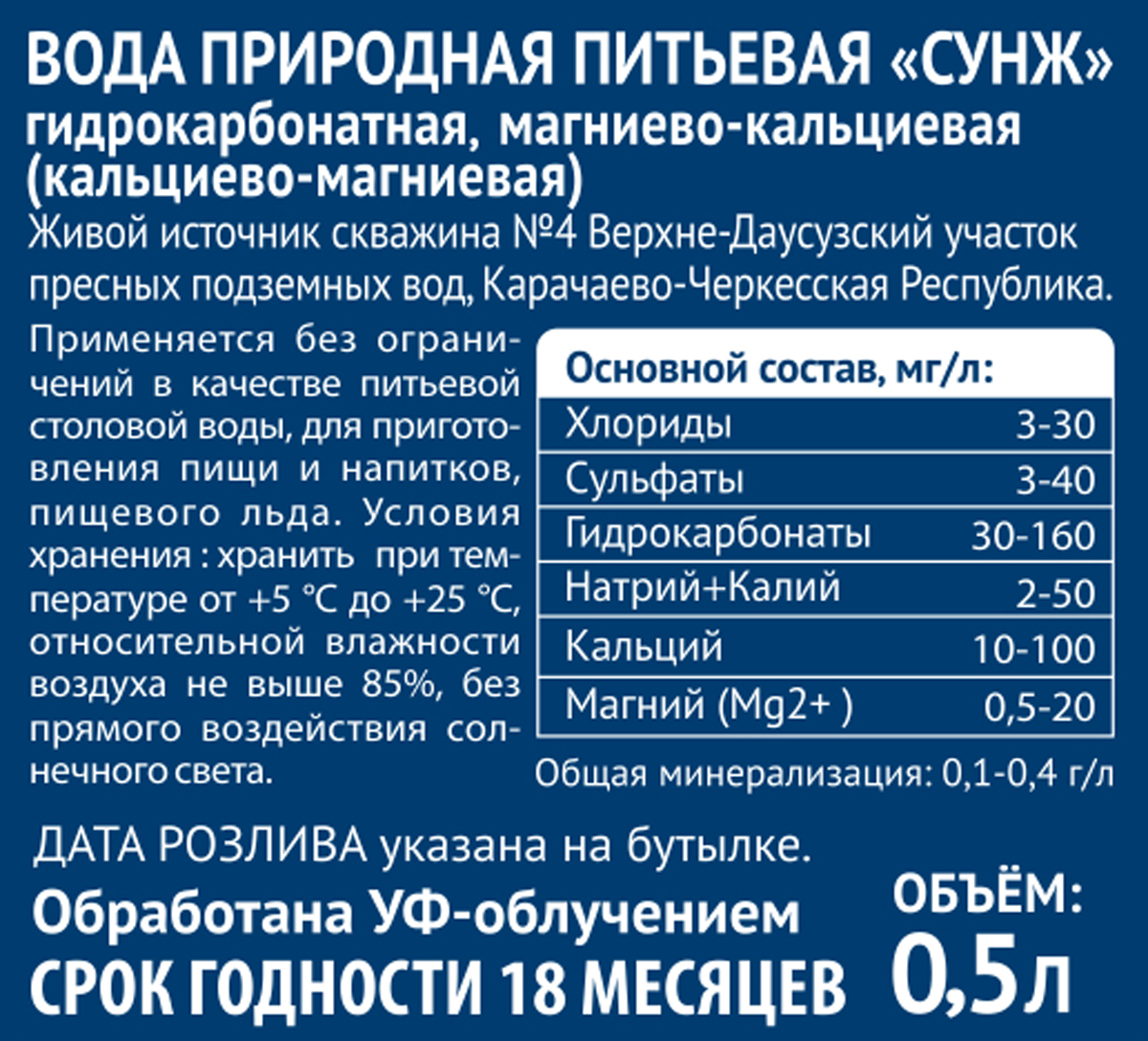 Негазированная природная ледниковая вода — это основная достопримечательность экологически чистого региона Карачаево-Черкесской республики, находящегося в окружении известных заповедников и каскадов гор. Именно здесь в верхних участках ледников на высоте 1100 метров над уровнем моря зародился живой источник воды «СУНЖ», что в переводе с тюркского, обозначает «ледниковая вода». Добывается вода в официально зарегистрированной скважине № 4 Верхне-Даусузского участка. Эта вода содержит необходимые для человеческого организма микроэлементы: натрий, кальций, магний, а также минеральные соли. Ледниковая вода оказывает общеукрепляющее действие, хорошо стимулирует иммунную систему организма, утоляет жажду. Является источником психологического здоровья и долголетия.