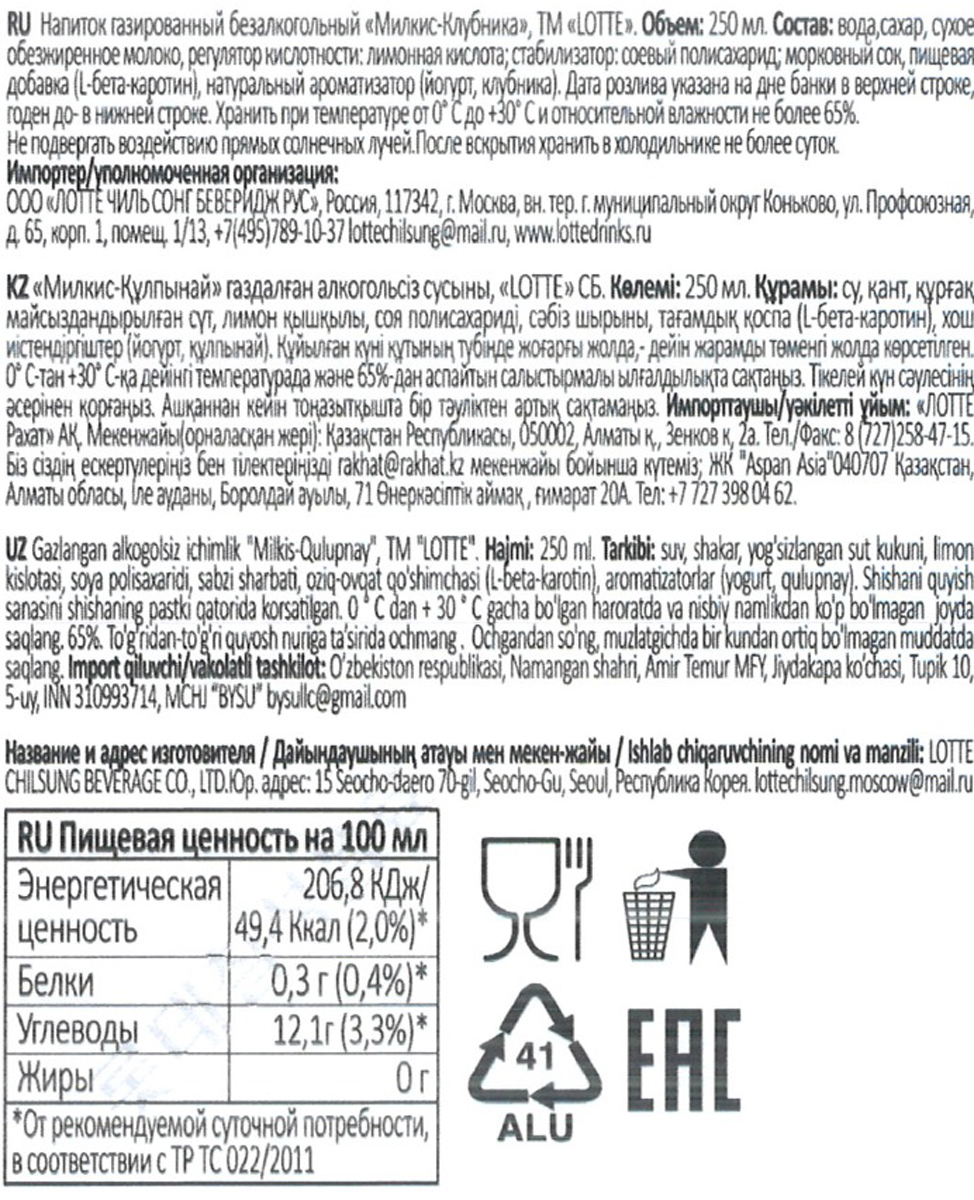 Вкусный и витаминизированный напиток для всей семьи отлично утоляет жажду, не содержит вредных добавок. В основе напитка лежит молоко. Обогащен кальцием, витаминами А и D, не содержит белков и жиров. «Милкис Клубника» — это нежные сливки с натуральной клубникой. Очень легкий и освежающий благодаря удивительному сочетанию молока, клубники и газированной воды.