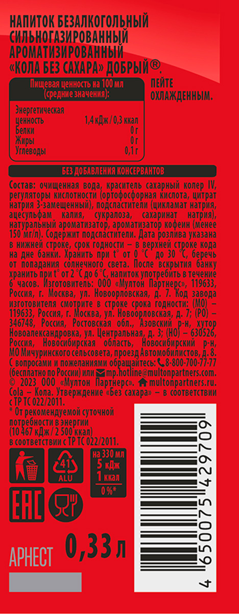 Напиток газированный Добрый кола без сахара ж/б 0,33 л