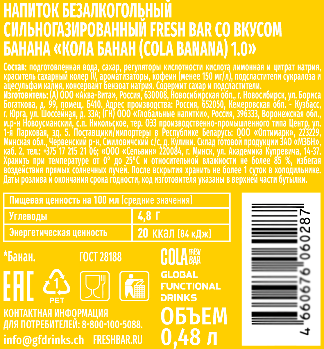 Напиток газированный Fresh Bar Кола Банан 0,48 л