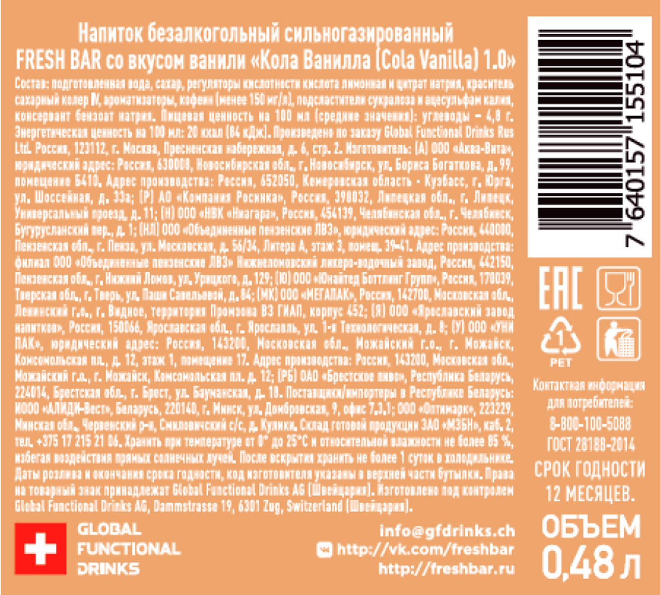 Газированный напиток Fresh Bar Кола Ванилла 0,48 л