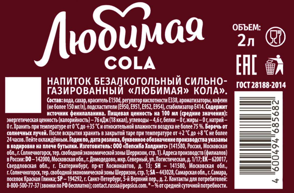 «Любимая» кола – это новое предложение среди газированных напитков от известного бренда «Любимый». Газированный напиток со знакомым вкусом классической колы, с характерными сладкими нотками ванили и корицы. Утоляет жажду, оставляя после себя приятное покалывание тысячи пузырьков и долгое насыщенное послевкусие. Охлажденный напиток с глубоким и интенсивным вкусом в добрых традициях семейных застолий.