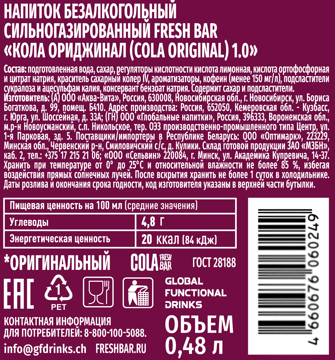 Напиток газированный Fresh Bar Кола Ориджинал 0,48 л