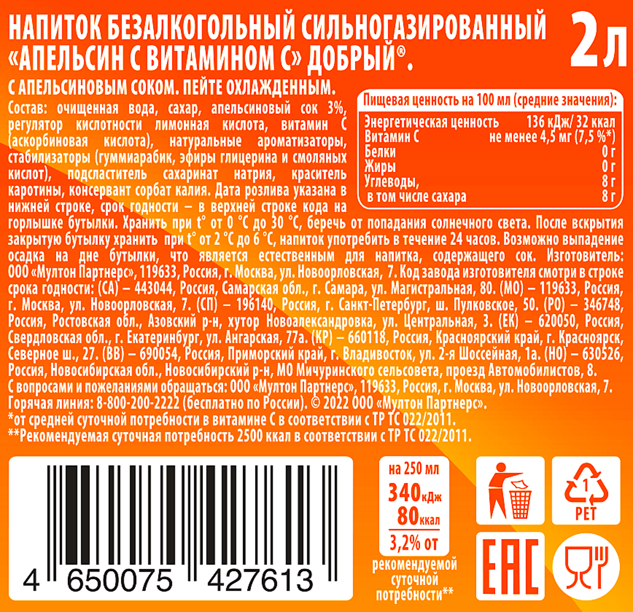 Напиток газированный Добрый апельсин 2 л
