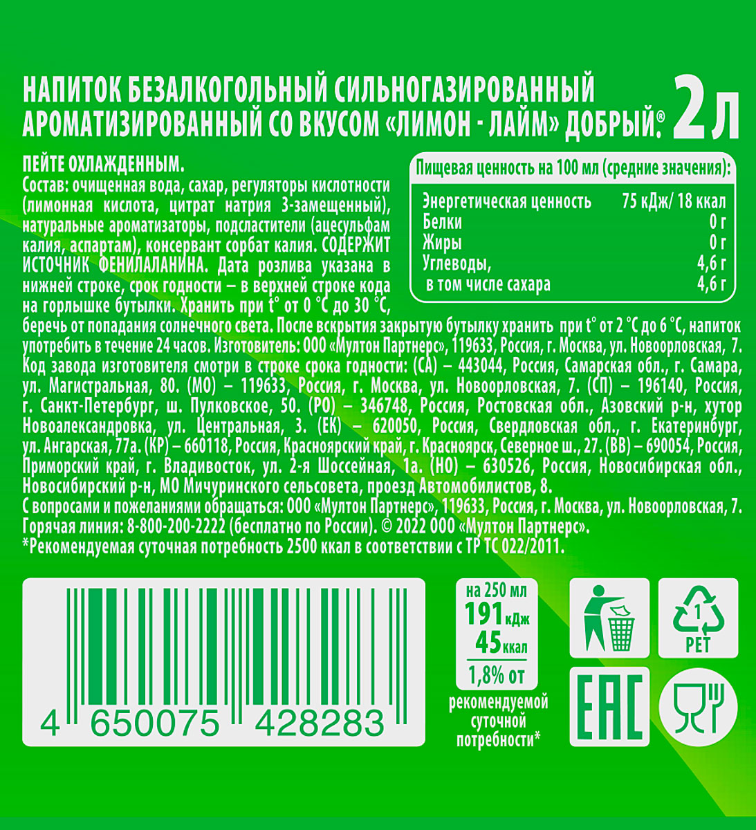Напиток газированный Добрый лимон-лайм 2 л