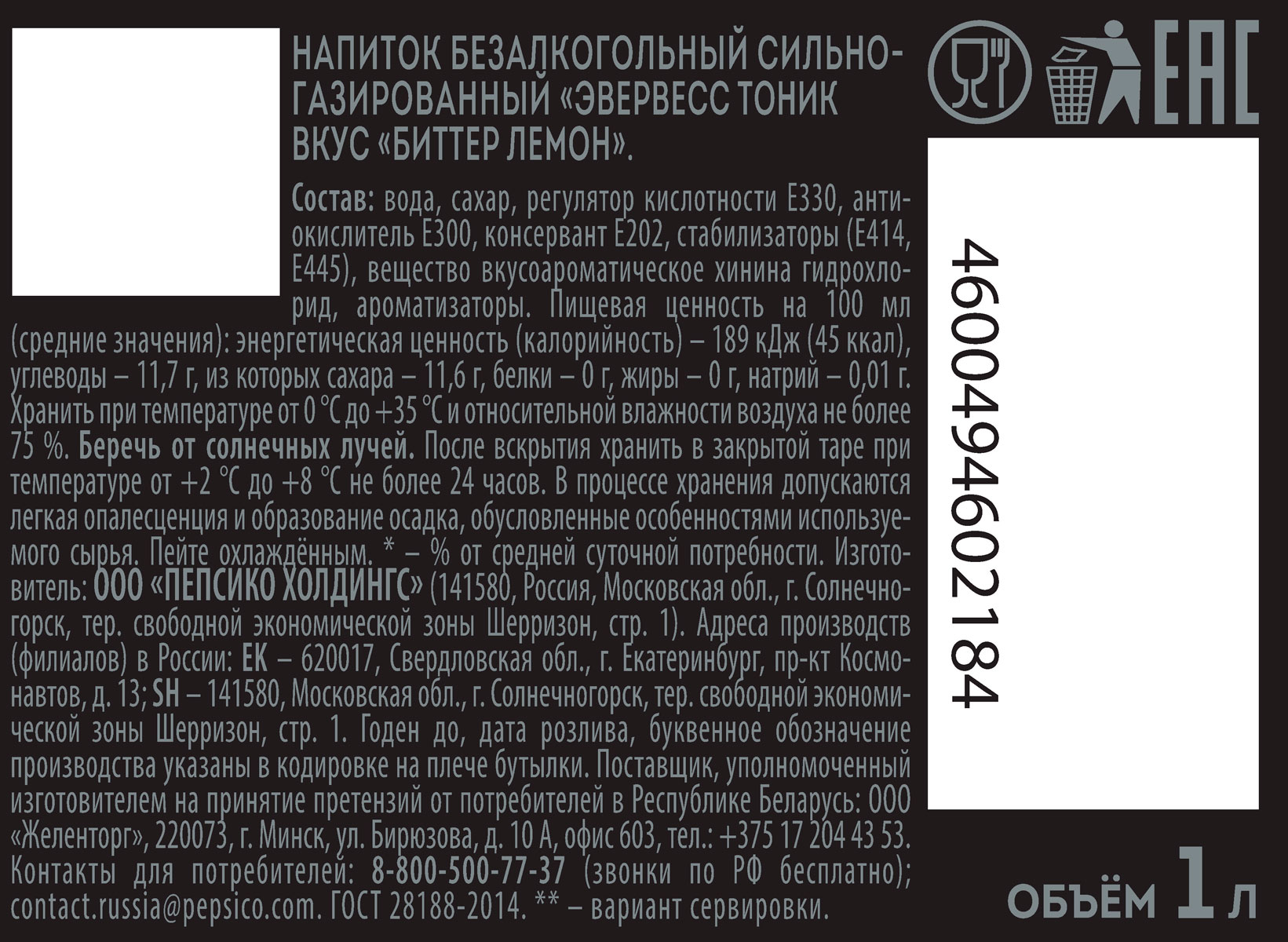 Газированный напиток Эвервесс Биттер Лемон 1 л