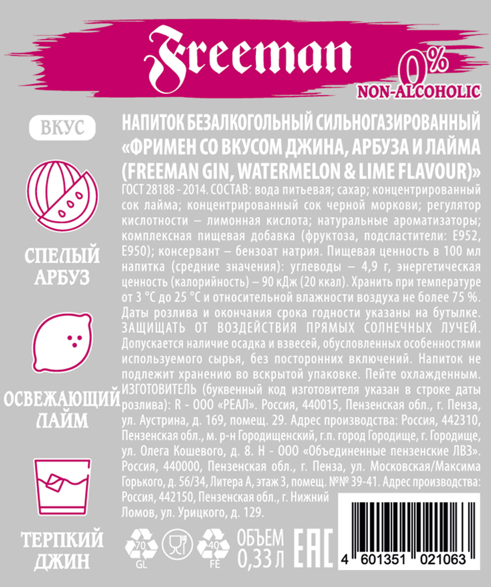 Напиток безалкогольный «Фримен» со вкусом джина, арбуза и лайма — это коктейль для тех, кто ценит необычный вкус, яркость и высокое качество традиционных газированных напитков. Напиток сочетает в себе можжевеловый аромат, сочность и сладость арбуза, оттеняемую пикантными нотами сочного лайма, создавая удивительно яркий и неординарный вкус.