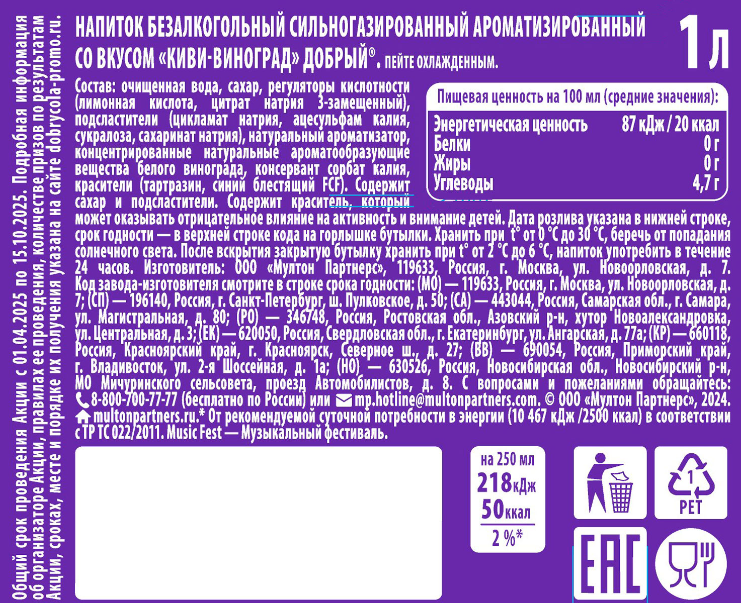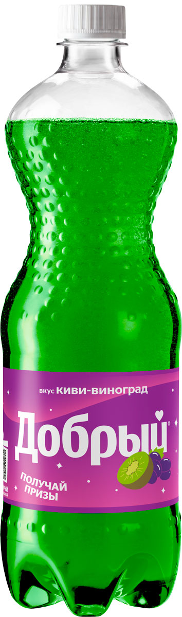Новый сильногазированный напиток Добрый со вкусом «Киви-Виноград» – это яркий вкус экзотического киви в сочетании со спелым виноградом и множеством пузырьков. Заряд хорошего настроения, которым так хочется делиться с тем, кто рядом. Пейте охлажденным!