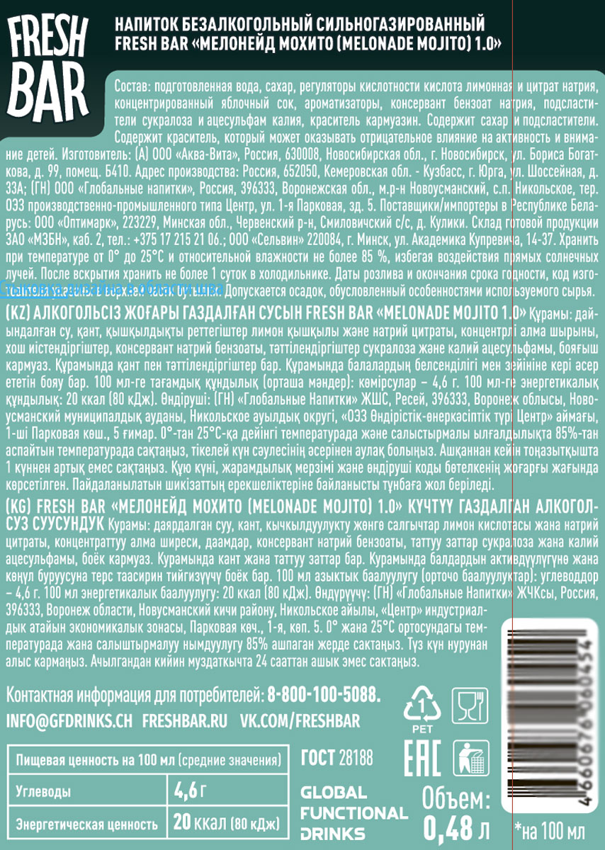 Напиток газированный Fresh Bar Мелонейд Мохито 0,48 л