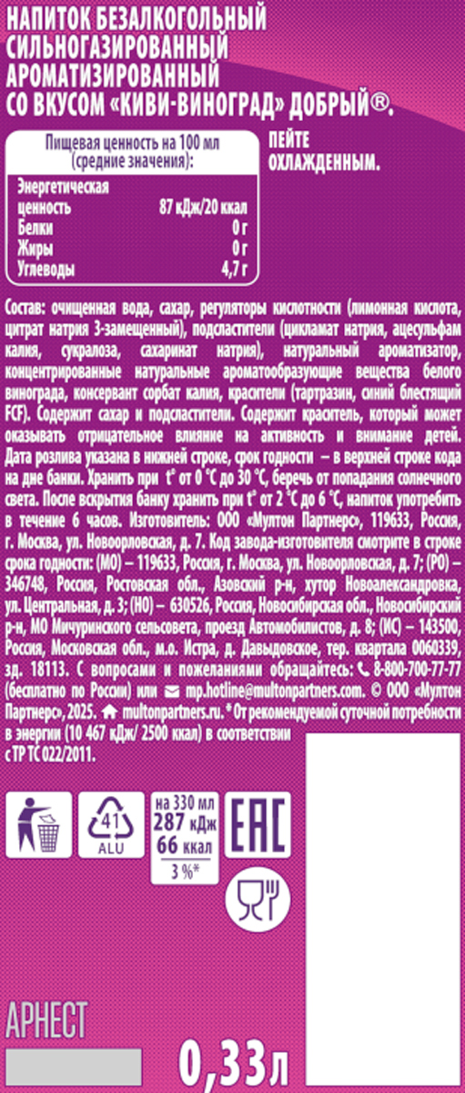 Новый сильногазированный напиток «Добрый» со вкусом «Киви-Виноград» – это яркий вкус экзотического киви в сочетании со спелым виноградом и множеством пузырьков! Заряд хорошего настроения, которым так хочется делиться с тем, кто рядом. Пейте охлажденным!