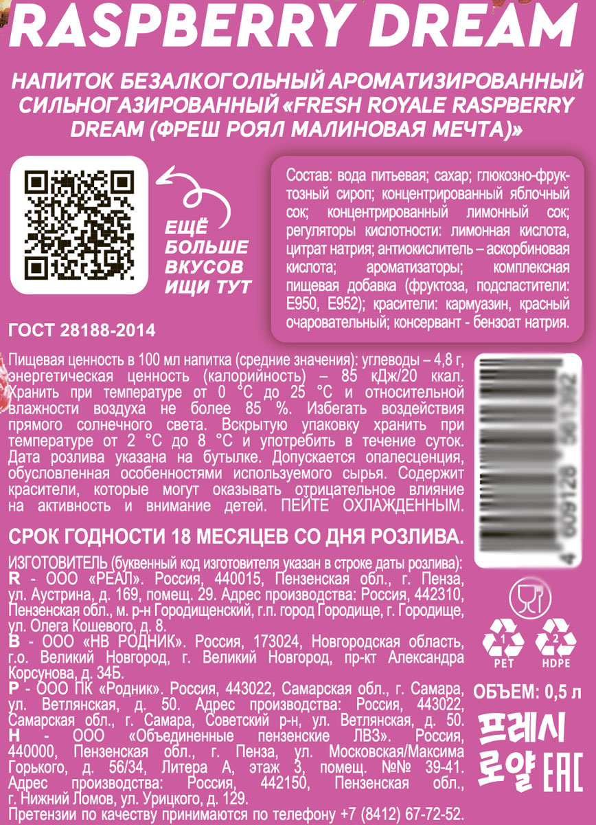 Напиток газированный Фреш Роял Малиновая мечта 0,5 л
