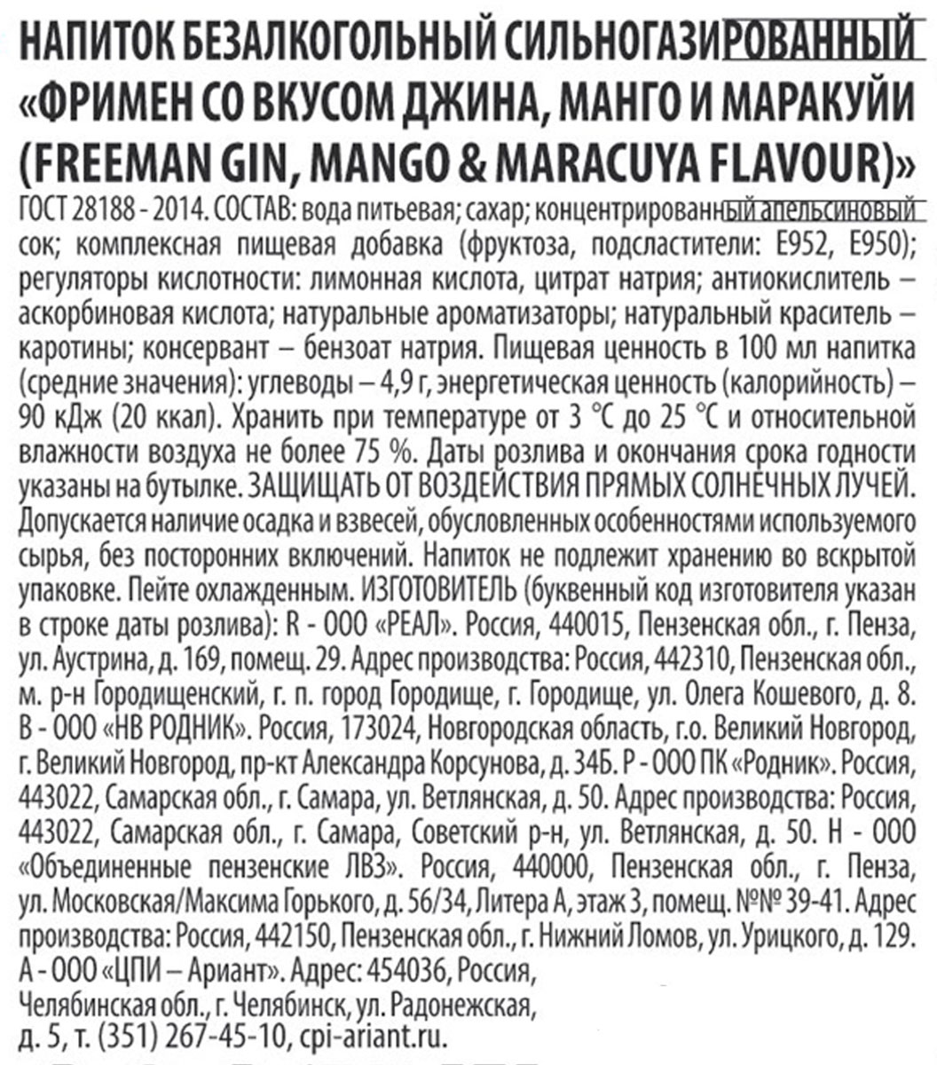 Напиток газированный Фримен Джин Манго Маракуйя ст