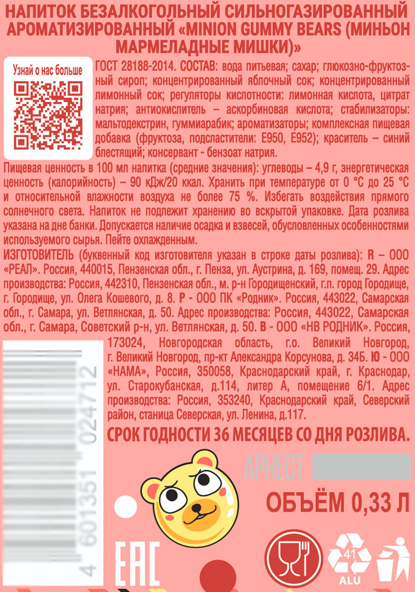 Напиток газированный Миньон Мармеладные мишки ж/б 0,33 л