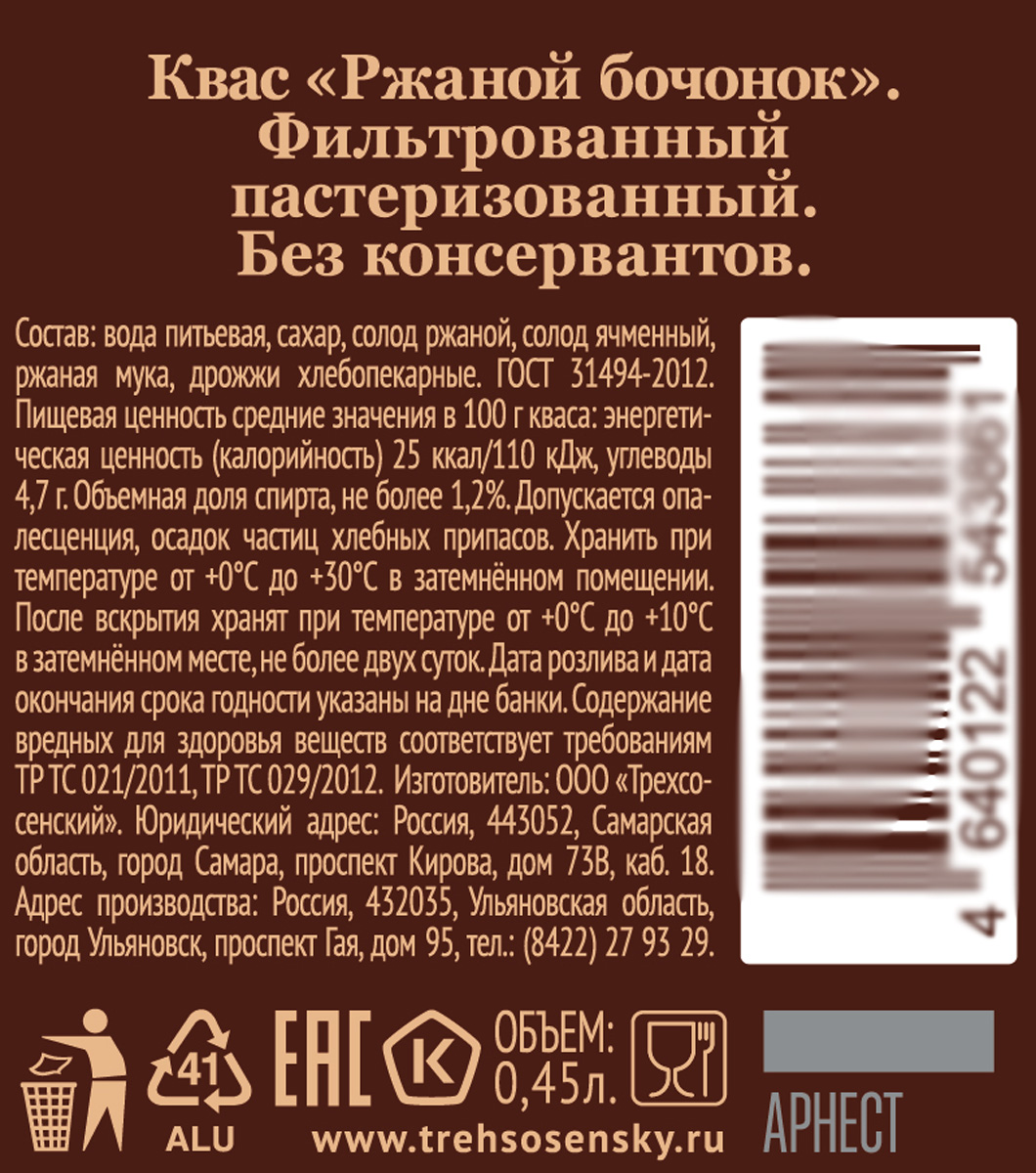 Квас Ржаной бочонок фильтрованный пастеризованный ж/б 0,45 л
