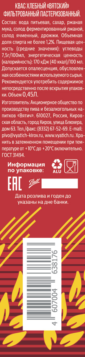 Квас Вятский хлебный фильтрованный пастеризованный ж/б