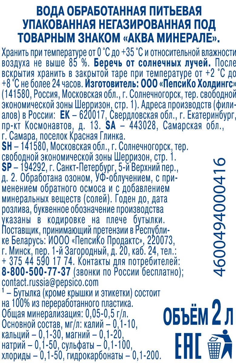Вода Aqua Minerale появилась в России в 1995 году и стала одним из первых в сегменте питьевой бутилированной воды. С тех пор Aqua Minerale полюбилась потребителям и остается одной из самых популярных на рынке — ежедневно в России продается более 700 тысяч бутылок Aqua Minerale. Негазированная Aqua Minerale с удивительно мягким вкусом прекрасно утоляет жажду. Подходит для частого употребления.
