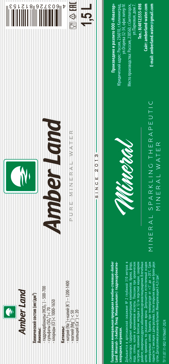 Amber Land Mineral добывается в артезианской скважине № 2 глубиной 310 метров в г. Светлогорск. Содержит микроконцентрацию компонентов: брома, фтора, йода, селена, калия и кремниевой кислоты. Показана при хронических гастритах, язвенной болезни желудка и 12-ти перстной кишки, сахарном диабете, ожирении и других заболеваниях органов пищеварения. В лечебных целях применять по указанию врача.