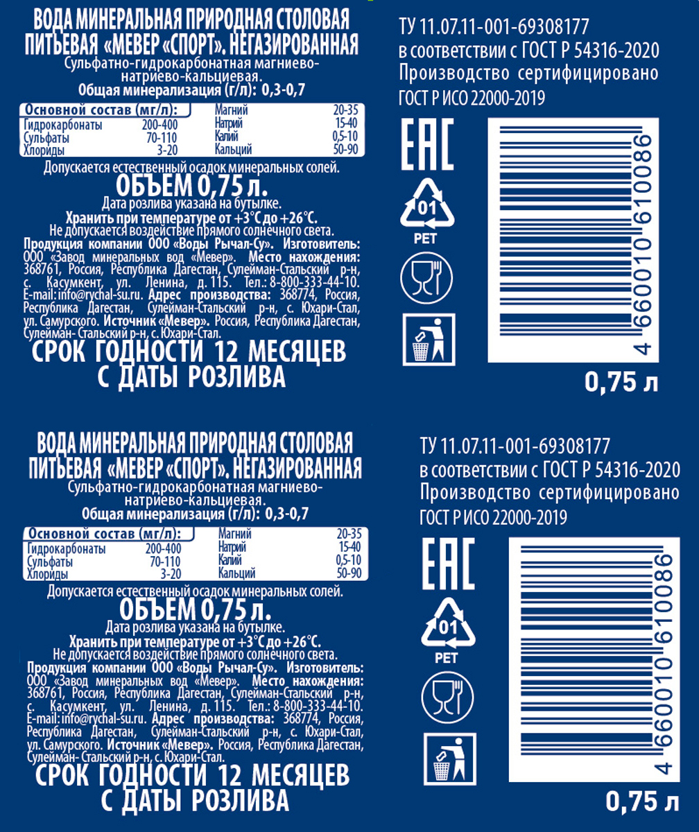 Вода минеральная Мевер Спорт негазированная 0,75 л